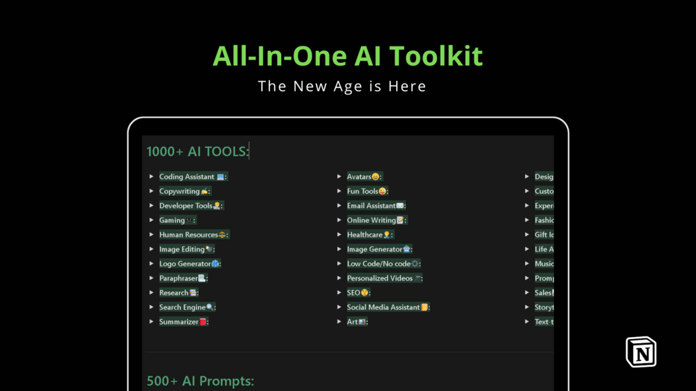 The All-In-One toolkit is a massive toolkit for AI that covers all the tools and prompts you need to utilize Artificial Intelligence and ChatGPT to your advantage.